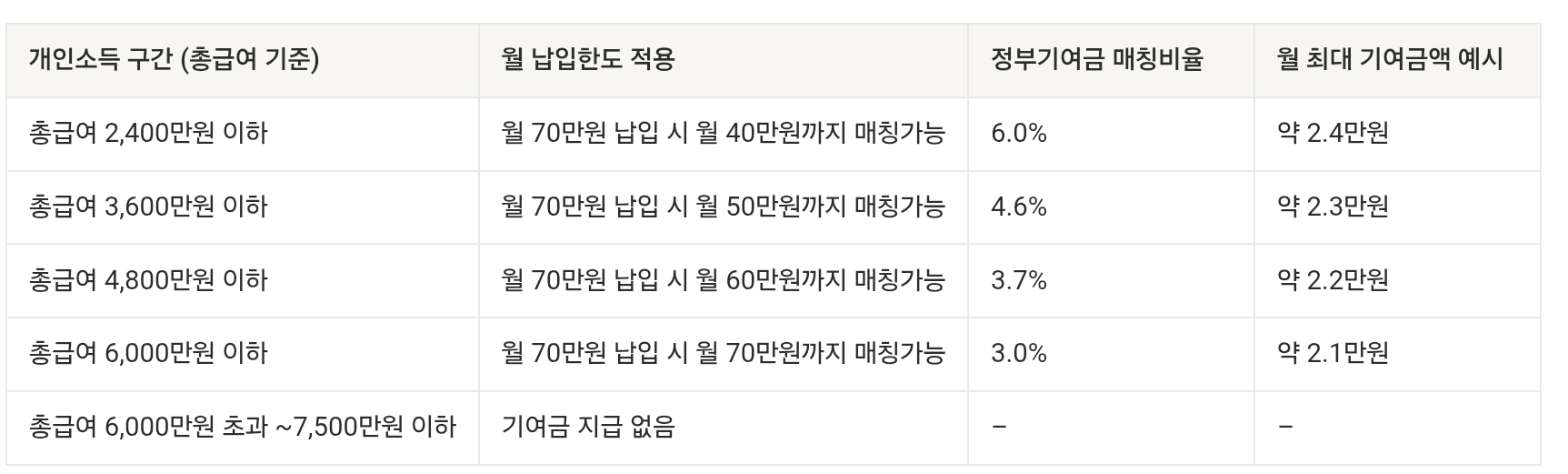 : 매월 납입한 금액에 대해 소득구간별로 정부가 일정 비율의 기여금을 지급합니다.